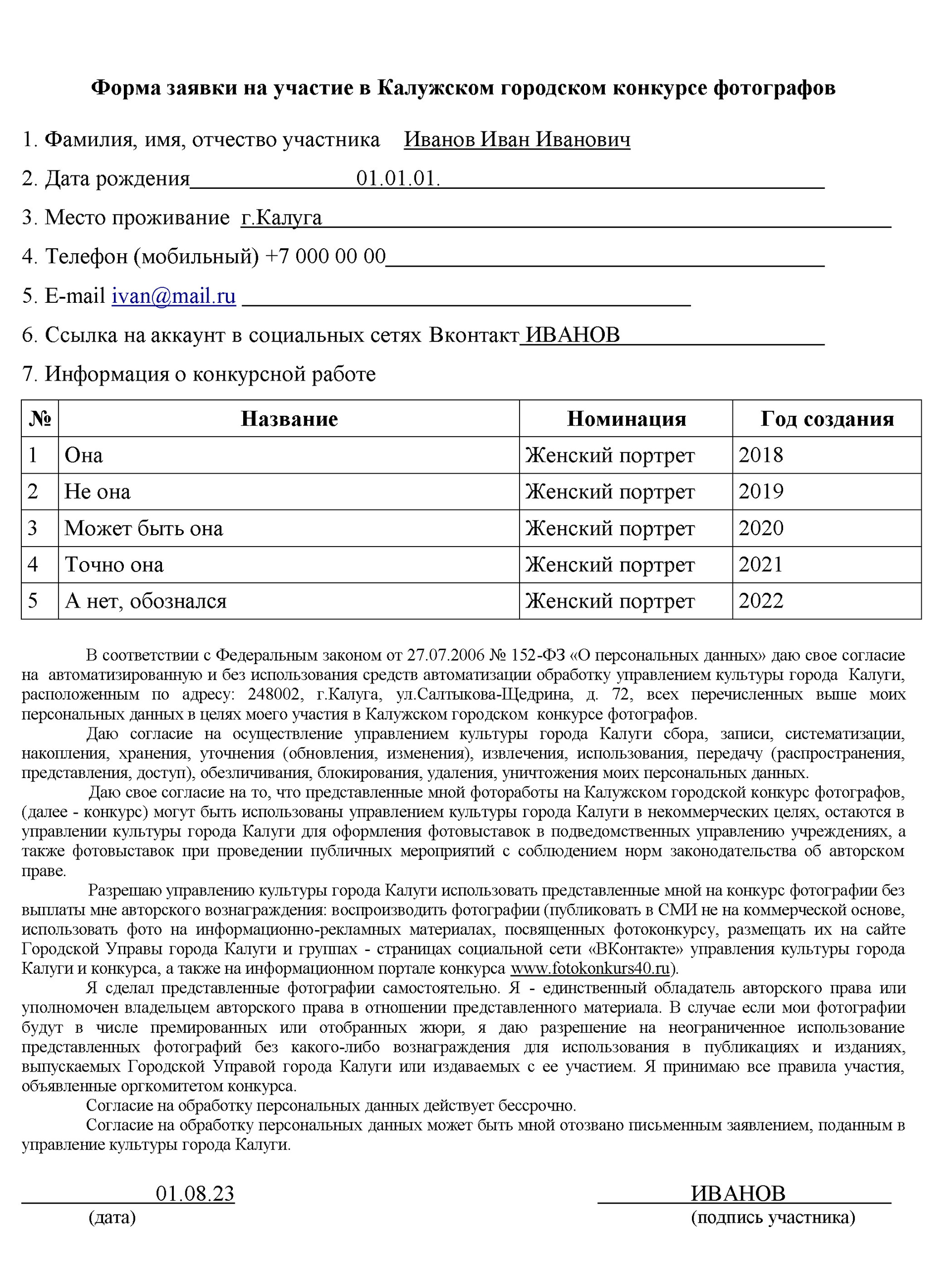 - скачать форму заявки и распечатать (если нет возможности распечатать, можно взять бланк в управлении культуры города Калуги по адресу: г. Калуга, ул. Салтыкова — Щедрина, д. 72, каб.13 (с 9:00 до 17:00. Обед с 13:00 до 14:00);